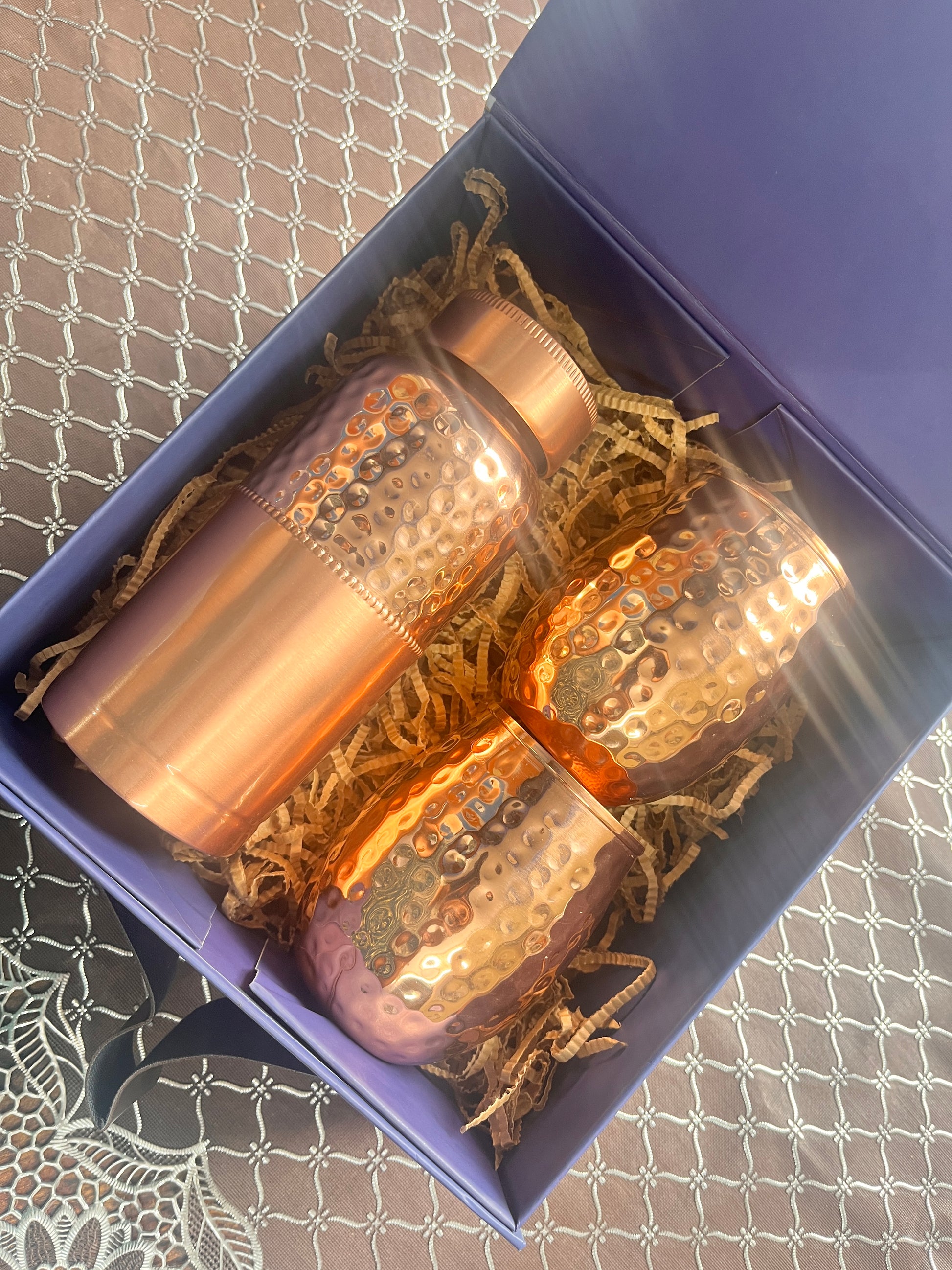 Elevate your gifting game this Diwali with our Hammered Mini Bottle & Glass Set. Crafted from premium copper with a stunning hammered finish, this 500ml set combines elegance and functionality. Perfect for festive celebrations, corporate gifting, or personal use, it includes: